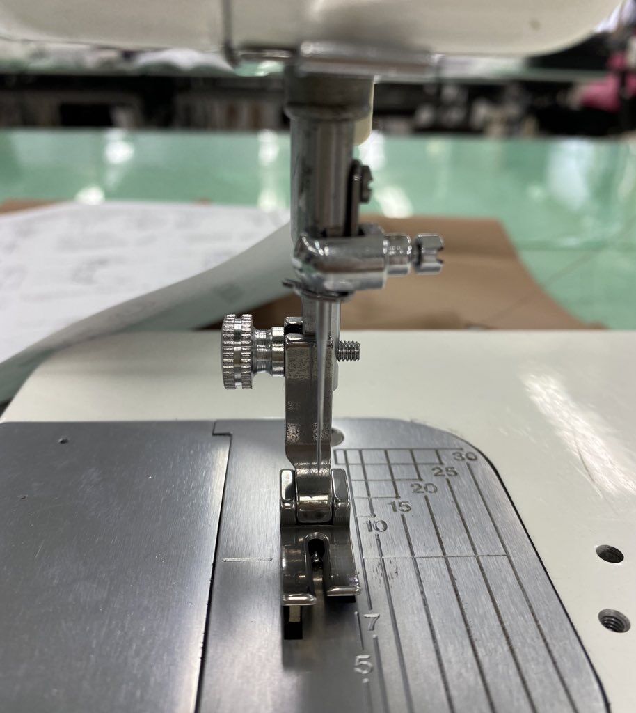 初めての職業用ミシン。ボビンや布の押さえなども家庭用とは違い、自分専用のボビンケース、ボビン、針、押さえをミシンにセットするというところから学びました。